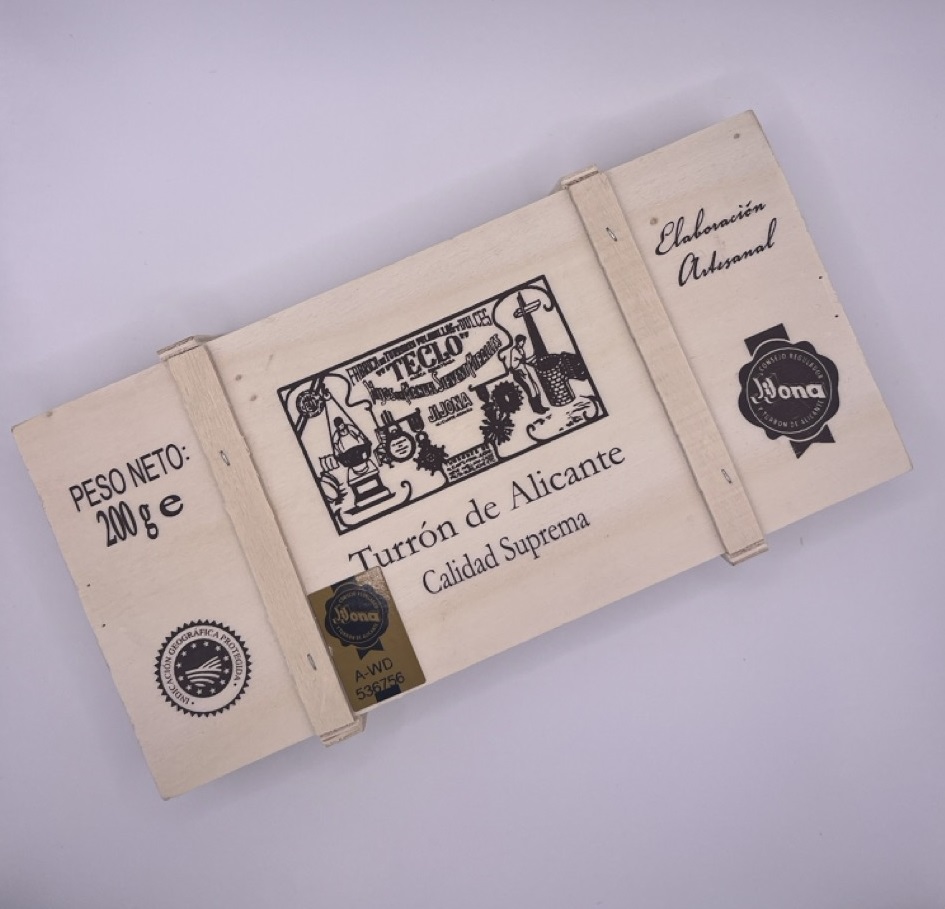 Turrón de Alicante en caja de madera Teclo 200 gramos